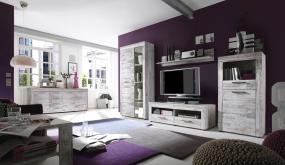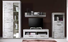 Bestehend aus einem TV-Unterteil, einer großen Vitrine, einem Highboard und einem Wandboard überzeugt das Set mit viel Stauraum.