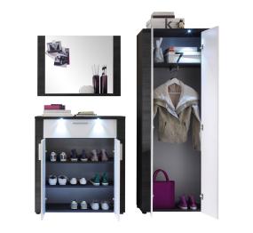 Das Garderobenset Xpress ist dreiteilig. Es besteht aus einem Hochschank, einem Schuhschank und einem Wandspiegel. Der Garderobenschrank ist mit sieben Einlegeböden und einer Kleiderstange ausgestattet. Der Frontspiegel befindet sich auf der linken Seite der beiden Türen. Die Schuhkommode im Garderoben Set verfügt über drei Einlegeböden und eine Schublade. Sie lässt sich über zwei Türen öffnen. Der rechteckige Spiegel ist mit einem Ablageboard versehen. In den Garderobenschrank und in den Schuhschrank sind drei LED Unterbauspots eingebaut. Sie beleuchten das Garderobenset und den Eingangsbereich. Mit drei Strahlern bzw. 48 Lumen setzt das Garderobenset eine indirekte Beleuchtung um.